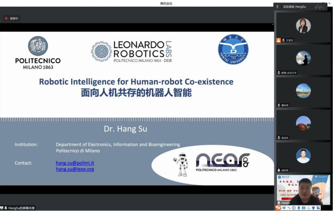 苏航作了题为“Robotic Intelligence for Human-robot Co-existence”的学术报告,刘兆伟副教授主持。苏航博士在报告中阐述了在多模态感知、人机交互和机器人控制领域提出的创新解决方案及可喜的成果,并介绍了团队为人与机器人的互动提出安全增强和多模态反馈的解决方案。