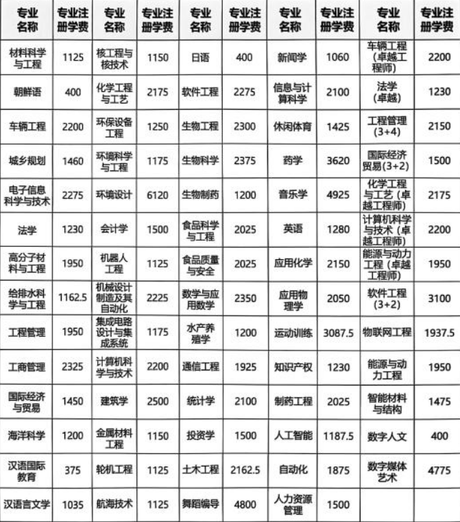 专业注册学费是学校对学生实施学籍、教学等管理收取的基础费用,按学年收取,每学年初缴纳后办理专业注册手续,获取本学年选课资格,各专业注册学费如下: