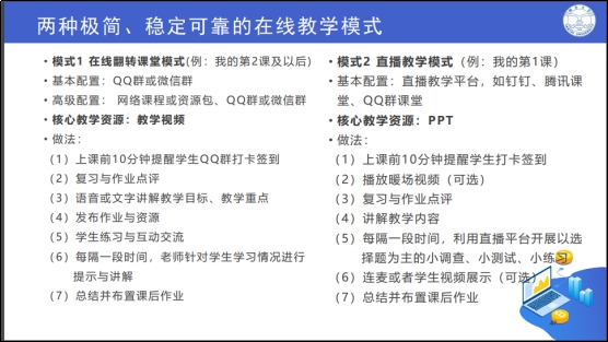贺老师围绕学校要求,结合自己多年来对网络教学的研究与体验,分别在平台的选用、教学资源的准备、教学的组织与实施、在线直播方法(流程、技巧、禁忌)、学生学习动机的激发等方面与大家进行了分享,并就相关问题与老师们进行了在线讨论。大家普遍感觉豁然开朗、受益匪浅,对接下来的网络教学具有很好的借鉴、指导意义。