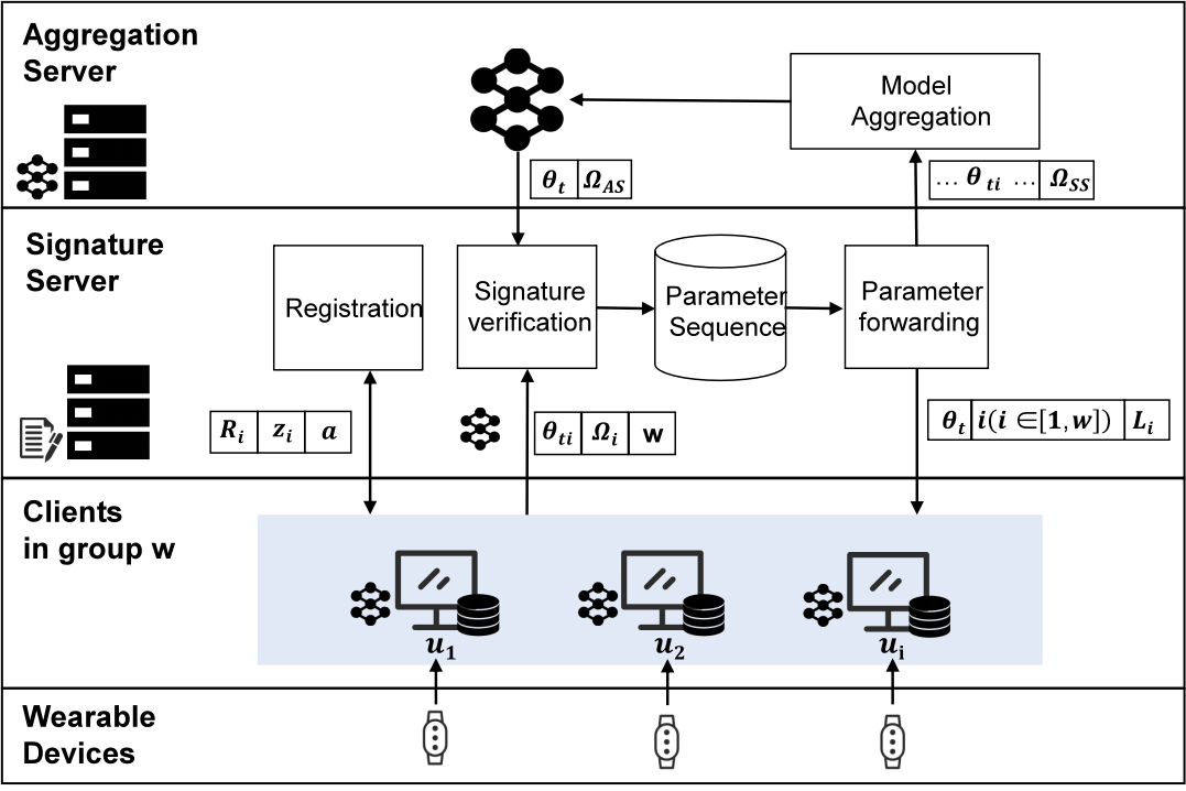 该论文针对智慧医疗领域隐私泄露和安全问题进行了分析研究,提出了基于环签名技术和联邦学习的智慧医疗系统架构。在系统中,人体生理指标由可穿戴设备采集,利用边缘计算设备进行本地训练,模型参数上传至中心服务器进行疾病预测。在此过程中,系统使用无证书环签名隐藏数据来源,可以有效抵抗源推理攻击;所提出的签名批量验证算法能够大大降低服务器的计算负载,使得基于可穿戴设备的智慧医疗系统能够大规模部署实施。