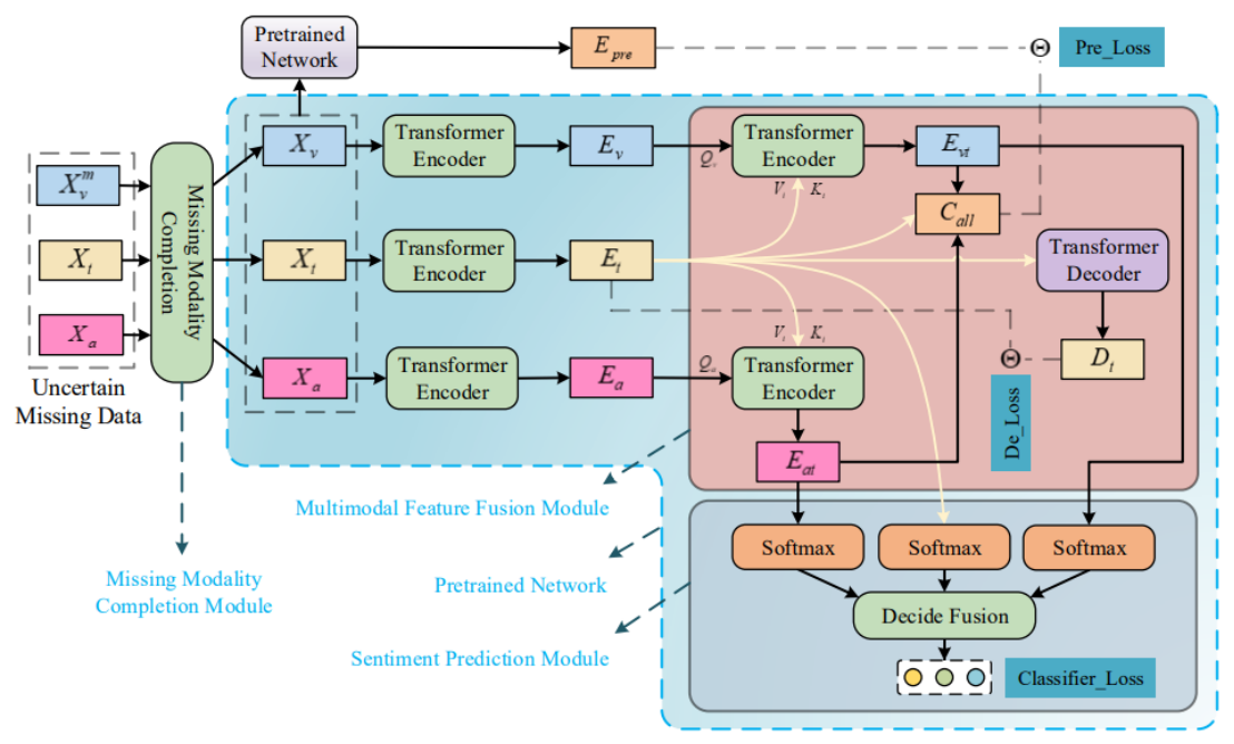 SMCMSA模型构建了全模态样本数据库,使用预训练的单模态情感分析模型对样本数据进行情感标签预测,通过设计两个独立的相似模态补全策略对缺失模态进行补全。对于补全后的数据,利用Transformer的Encoder模块对文本、视频和音频模态进行编码,并在预训练模型指导下进行模态融合,提升表示质量,并运用基于决策级融合策略得到最终的识别结果。目前,该模型的情绪识别准确度处于领先水平。该研究工作得到了国家自然科学基金项目、山东省自然科学基金重点项目、山东省泰山特聘学者项目、澳大利亚研究理事会(ARC)未来奖学金和发现项目的支持。