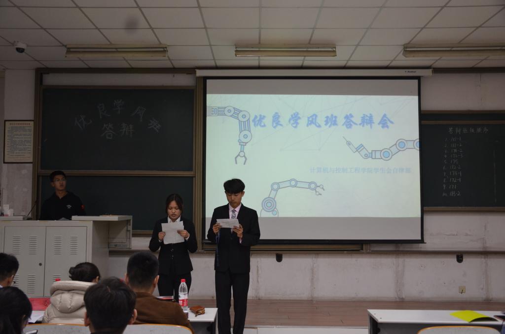 会议伊始,主持人向在座人员说明了此次活动的目的,答辩规则,评分标准,并介绍了本次活动的评委团成员。随后,与会班级答辩人员按照抽签顺序上台答辩。在会议过程中,各个班级代表通过ppt向大家展示班级的日常生活、班规班纪、上课出勤率、期末成绩、优秀学生所获奖项等内容,无不展示着同学们积极进取的精神风貌和计控学子的蓬勃活力。同时,评委们对代表展示的项目进行提问以进一步加强对入选班级的了解,有利于更透彻的分析入选班级的综合情况。台下同学们认真听取报告,学习优秀班级的活动举办思路和增强班级凝聚力的方法。会议最后,团委书记丁晓丹做总结发言,她首先对班级代表的精彩答辩表示肯定,并指出了答辩过程中存在的亮点与不足,随后她强调各班级应把工作重点放到学习上,尽最大努力提高学生成绩,同时她指出每日大赛 学风建设有待加强,各班要重视学风建设工作,争取取得更优异的成绩。最后,获奖班级合影留念,至此本次会议圆满结束。