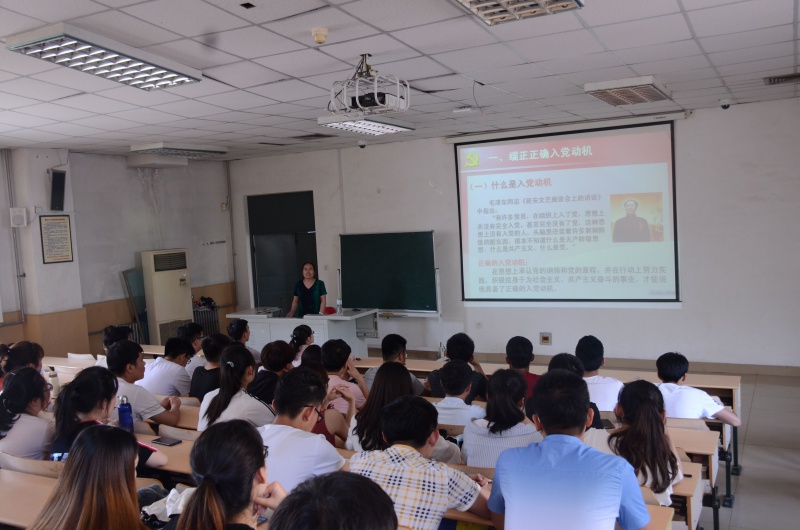 此次培训会主要面向全体2016级入党积极分子,由党总支书记秦月红担任主讲人,旨在通过以课堂培训的方式,帮助同学们端正入党动机,提高党性修养。会议伊始,秦月红从了解同学们的入党动机出发,重点强调了端正入党动机的重要性,并深入分析了造成动机不正确的一些因素,包括初涉政治生活的不成熟性,社会转型价值失衡以及家庭教育缺失等方面。随后,她针对同学们端正入党动机的方法提出一些建议,她指出“要正确端正入党动机,首先要在思想上承认党的纲领和党的章程,并在实际中努力实践”,希望同学们主动接受党组织的培养教育和考察,认真学习马克思主义理论,同时自觉加强党性修养和锻炼,此外还要正确处理入党过程中的矛盾和关系。最后,秦月红提出了树立理想信念的作用,她围绕着如何树立理想信念这一话题,提出三个“信”,要求同学们坚定马克思主义信仰,坚定共产主义信念,坚定中国特色社会主义自信,并分别详细阐述了理想、责任、奋斗、学习和品格的重要含义,希望大家能够成为合格的社会主义建设者和接班人。