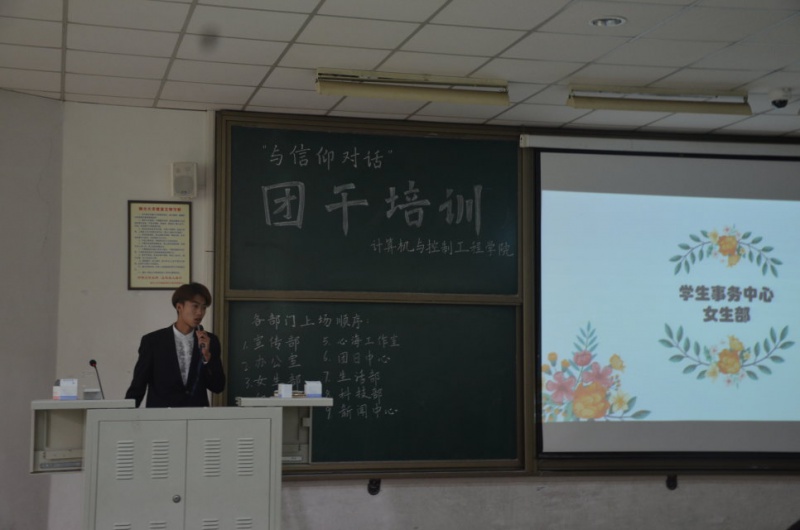 本次团干培训会面向2017级全体学生干部以及分团委学生会干部,旨在通过PPT讲解分团委学生会各部门职能的方式来帮助学生干部明确工作态度,切实发挥其在“自我管理、自我教育、自我服务”中的积极作用。会议伊始,宋健栋上台作相关发言,他重点强调了学生干部在组织工作中的重要作用,并要求各学习干部把握此次学习机会,认真听取各部门的讲解,明确工作职能,坚定信仰,力争上游,展示学生干部昂扬向上的青春风貌,此番讲话赢得了在场干部的一致认同。随后,伴随着阵阵掌声,宣传部,办公室,科技部等部门代表按照抽签顺序依次上台,并分别从部门职能,活动项目,考核标准等方面内容进行讲解,进一步加深了同学们对各部门的认识了解。最后,蔡新海上台作总结发言,他首先对部分部门职能作出补充,并对学生干部们提出了几点建议,他讲到,学生干部要不断提升自身水平,发挥主动性和模范带头作用,及时实施所下达的部署通知,做好学院与学生之间的协调工作,并以每日大赛的稿件征收为例,重点强调了学生干部的主动性和规范性。不少学生干部纷纷表示,这次团干培训会极大地帮助自己明确了学生干部的服务态度。至此,本次活动圆满结束。