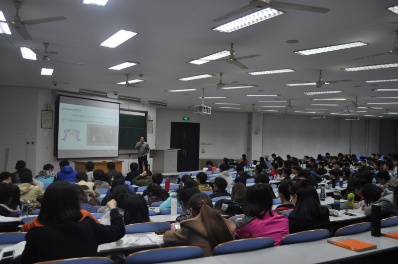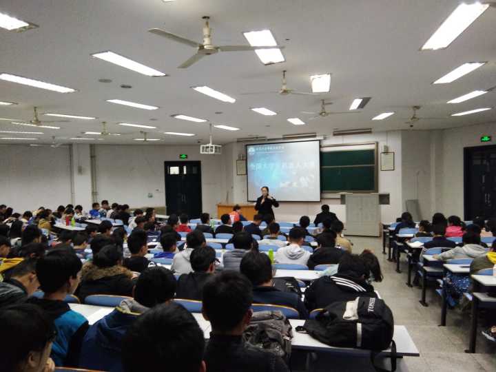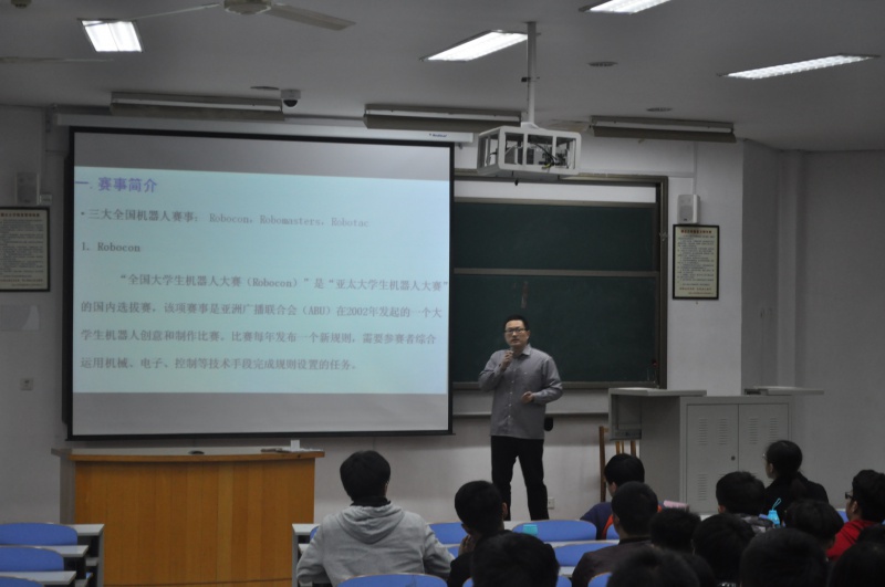 全国机器人大赛由共青团中央学校部、全国学联秘书处主办,教育部高等学校机械类专业教学指导委员会和计算机类专业教学指导委员会协办,共有Robocon,Robomasters,Robotac三项赛事。本次宣讲活动由学院辅导员蔡新海主持,并特邀王飞担任主讲。在观看完一段精彩的机器人大赛的相关视频后,指导老师王飞、张楠依次上台演讲,他们鼓励同学们踊跃报名纳新,号召同学们通过此次活动,激发自己科技创新的积极性,为自己的学业生涯提供更广阔的平台,其中,王飞凭借PPT和相关视频,就Robocon的赛事简介,关键技术和纳新安排三个方面进行讲解,他讲到,关键技术包括动作系统,感知系统,控制系统和交互系统,其中动作系统包括机构和伺机驱动,与感知系统并称为关键技术的基础,并谈及机构和伺机驱动等内容,王老师语言浅显易懂,深入浅出,引起了同学们的对赛事和纳新的极大兴趣和踊跃发问,最后,学院党总支副书记贺毅对本次活动进行总结,她谈到,学院高度重视纳新活动,将逐步落实经费计划和投入,并援引事例鼓励同学们基于自身兴趣,相时而动,学有所获,为将来的就业和考研做好准备。伴随着阵阵掌声,本次活动圆满结束。