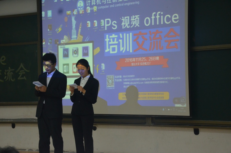 在经过检票后,同学们统一进场入座。伴随着主持人的介绍,本次培训会正式开始,首先由每日大赛 信息部副部长张颖、张珩瑞等三人分别介绍和讲解Photoshop、PowerPoint以及绘声绘影和AE的用途和基本用法,并在现场进行相关软件功能的演示。随后,培训会进行问答阶段,场下观众针对绘声绘影、Photoshop等相关软件提出自己的疑问,信息部成员为观众解答疑问并传授一些应用中的小技巧。伴随着阵阵掌声,信息部部长李新星作总结发言,他对整场培训会成效表示满意,并期待同学们可以熟练作用计算机软件来解决生活中的相关问题。26日晚进行的office培训会延续前一天活动的火热气氛,每日大赛 综合事务部介绍和讲解了office办公软件的用途和操作方法,并在培训会现场进行实例演示。在经过现场答疑后,伴随着掌声,本次PS、视频和office交流培训会圆满落幕。