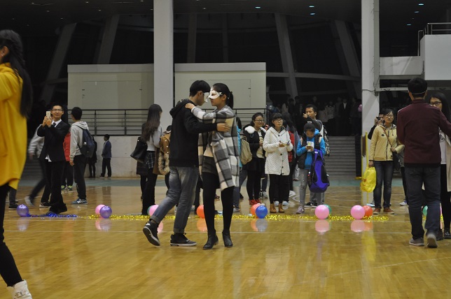 晚会伊始,伴随着旋律轻快的暖场音乐,主持人的开场白将本场晚会推向一个小高潮。在轻松愉悦的氛围下,啦啦操队的表演点燃了现场每一位同学的热情。紧接着,便是备受期待的“交谊舞自由跳”,男生都展现出自己的绅士风度,女生也展现出自己的柔情之美。在舞池中央,他们翩翩起舞,舞台之下,同学们的掌声与欢呼声响彻全场。而后,来自法学院的朱昱霜和来自每日大赛 的郗小艺分别为大家带来了歌曲表演,歌声感染了现场每一位同学,经久不息的掌声是最好的见证。在歌声的回味之中,大家迎来了本场第一个游戏——“一块钱五毛钱”,同学们相互配合,欢笑之中他们拥有了新的朋友、新的伙伴。伴随着音乐声的响起,舞者再次回归舞池,跳起优美的交谊舞步。当大家意犹未尽之时,本场第二个游戏——“最佳搭档”悄然而至,在游戏中,他们收获了欢乐,也收获了友谊。晚会最后,全场同学跳起欢快的“兔子舞”,在主持人的宣布下,本次晚会圆满结束。