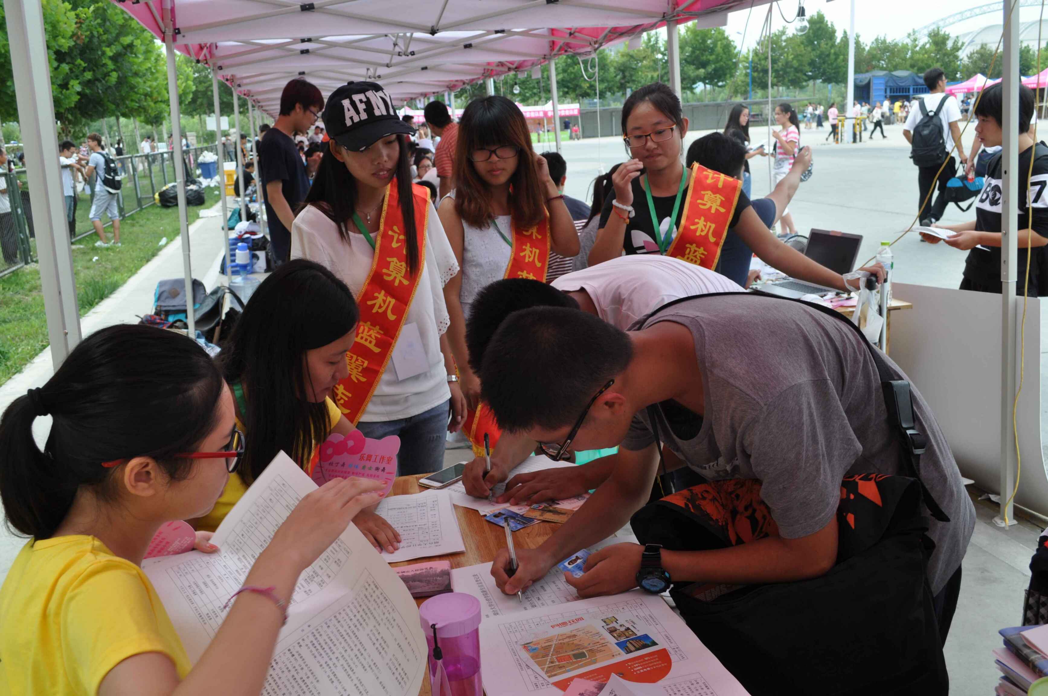 蓝翼志协成员与分团委学生会各部门成员一起在新生报到区为新生提供服务。