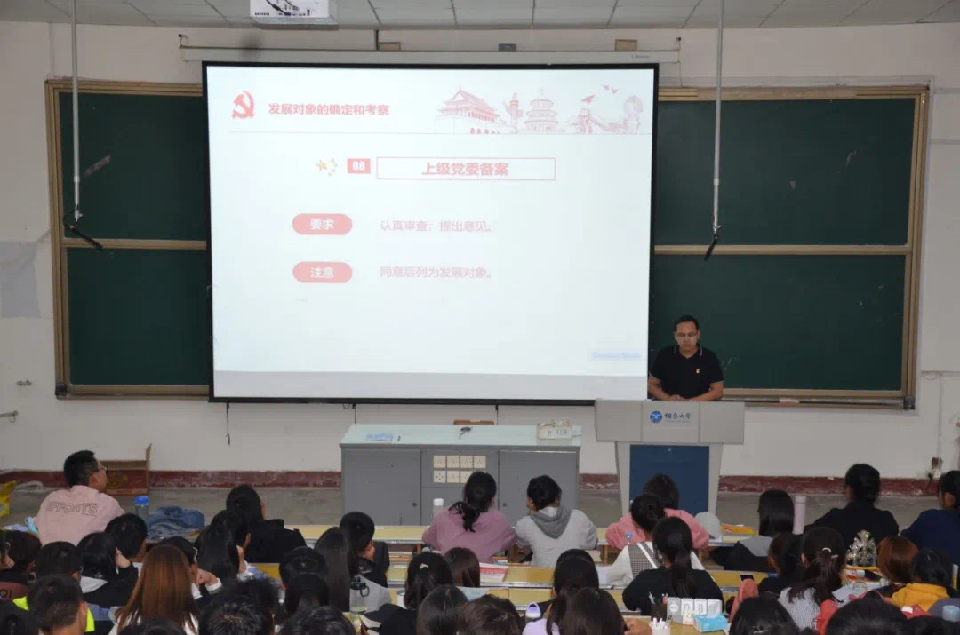 为了增强课堂效果,本次活动特意安排在二教102、104两个教室同时进行。课堂伊始,主持人为同学们播放了中国共产党成立以来中国共产党人的先进事迹和疫情期间基层党员的记录视频,“我是党员,我先上”,“我是党员,我带头”,党员们催人泪下的战“疫”事迹和温暖人心的逆行背影,深深地打动了在场的同学们。视频结束后,秦月红结合自身二十多年的工作经历,从“理想”、“使命”、“担当”、“专业”等几个方面与2020级新生进行了分享交流,她鼓励同学们积极践行社会主义核心价值观,传承红色基因,将党课思想精髓内化于心、外化于行,点燃灿烂青春,争做时代新人。秦月红将思政教育融入于讲话之中,精彩的发言赢得了新生们的阵阵掌声。随后,丁晓丹和蔡新海结合党章和发展党员工作细则,向同学们详细介绍了入党的条件和流程。丁晓丹在演讲中提到今年战“疫”中所体现出的中国特色社会主义制度优势,并向同学们详细阐释了坚持党的领导、坚持以人民为中心、集中力量办大事和打造人类命运共同体等几个重要概念。蔡新海在演讲中指出,作为大学生,要有立场、有声音,要学会明辨是非,勇敢担当。他强调,大学是一个重要的阶段,除了学习知识技能,还要积极拥护党的领导,拥护中国特色社会主义制度,立志成为社会主义的合格建设者和接班人。
