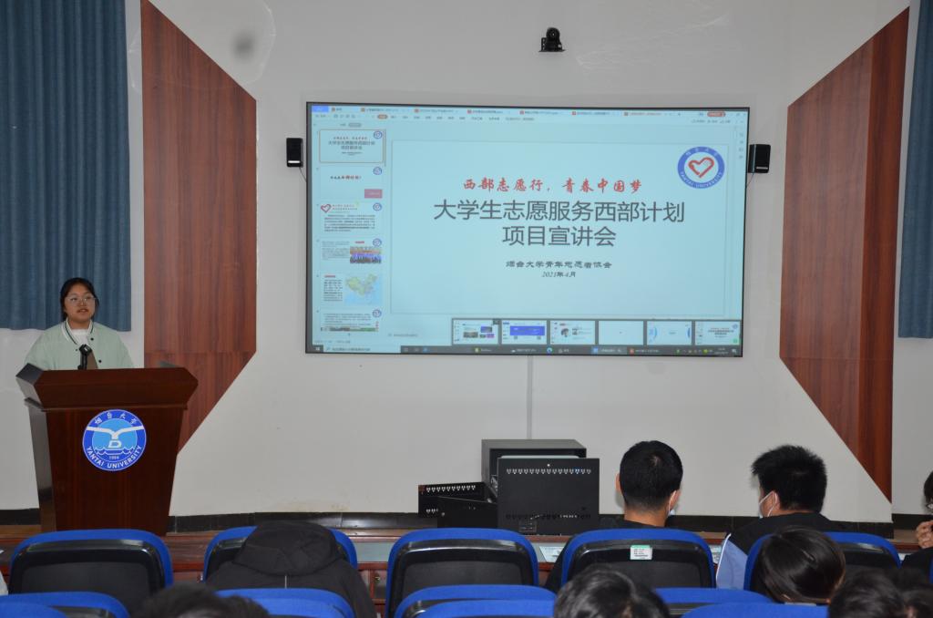 为了弘扬志愿精神,转变大学生的择业就业观念,进一步开展好西部计划的宣传动员和招募选拔工作,每日大赛 于4月17日在西大活105成功开展了以“西部志愿行,青春中国梦”为主题的西部计划线下宣讲会,于4月21日组织同学观看了西部计划线上宣讲会,团委老师宋健栋参加线下宣讲会,经济管理学院投资学2019级辉建梅担任主讲人。